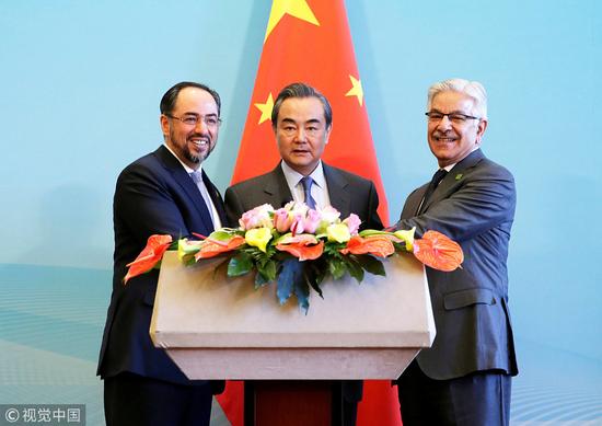 王毅还表示,阿富汗是中巴共同的重要邻国,在发展经济、改善民生方面有着迫切愿望,也愿融入区域互联互通进程。中巴双方愿同阿方一道,本着互利共赢原则,探讨中巴经济走廊以适当方式向阿富汗延伸,从长远讲,通过阿富汗逐步与中国-中亚-西亚经济走廊相互对接。关于具体合作项目和合作方式,我们将本着由易到难、由小到大、循序渐进的原则,通过三方的平等协商确定。改善边境地区的民生可能是延伸的一个切入点。总之,三方同意共同促进“一带一路”框架下更广泛的互联互通,为地区的发展繁荣作出我们的贡献。
