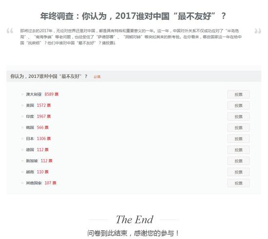 原标题:2017谁对中国最不友好?网民票选第一是它!