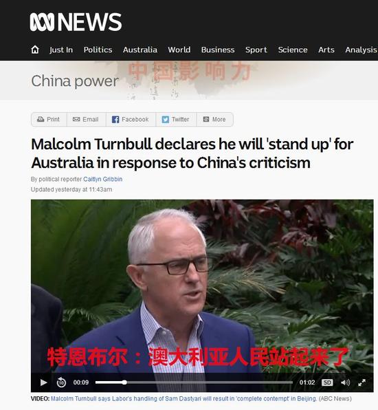 最近一段时间,澳大利亚部分政客频繁发表对华不友好言论,总理特恩布尔还用中文喊出 “澳大利亚人民站起来了”。这些话在中国网民听来比较刺耳,记忆也犹新,这或许是澳大利亚能够在这项调查中“登顶”的原因之一。