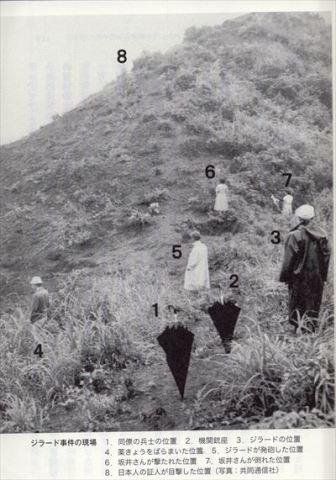 根据目击证人指称,吉拉德往空地抛掷空弹壳,示意日本民众可以过来捡拾,目击者便与被枪杀的日本妇女前往捡拾,随后就发生枪击事件,46岁日本妇女当场被击毙,身后留下六个小孩。尼寇承认有抛掷空弹壳,吉拉德否认有抛掷空弹壳,也没有瞄准妇女开枪(吉拉德否认的证词,没有通过美国陆军的测谎)。