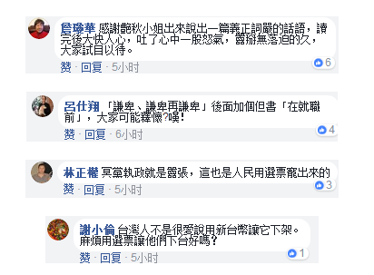 对于李艳秋的文章,众多台湾网友纷纷留言称,“义正言辞,读完大快人心”、“蔡英文在就职前,谦卑谦卑再谦卑”、“民进党执政就是嚣张”、“用选票让他们下台”。