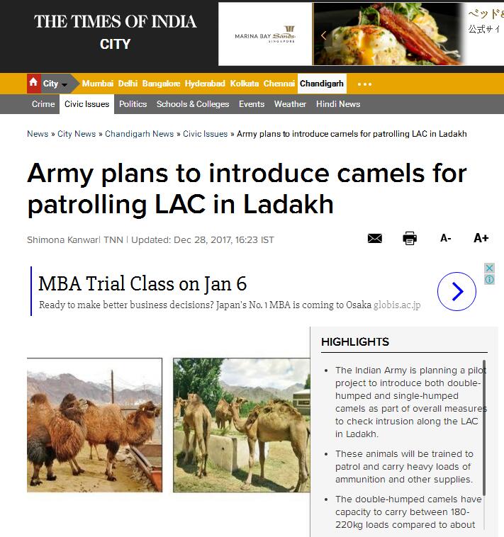 《印度时报》称,尽管中印在洞朗地区已经解除对峙,但印度陆军“仍然担忧中国士兵会在该地区出现”。鉴于这种情况,他们计划采取一个试点项目——即在中印边界地区引入骆驼,作为检查拉达克地区中印实控线周围有无“入侵”的综合措施的一部分。