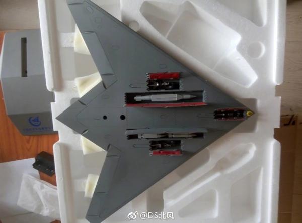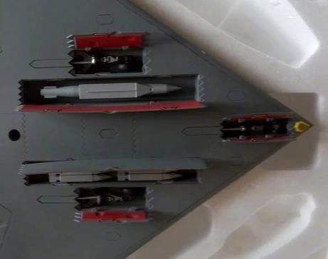 模型腹部照片,可见但舱内的小口径卫星制导炸弹和500公斤卫星制导滑翔炸弹,同时也可以看到机鼻下方的黄色光电装置