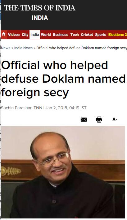 军事:印度任命新外交秘书 称其在洞朗事件中起关键作用