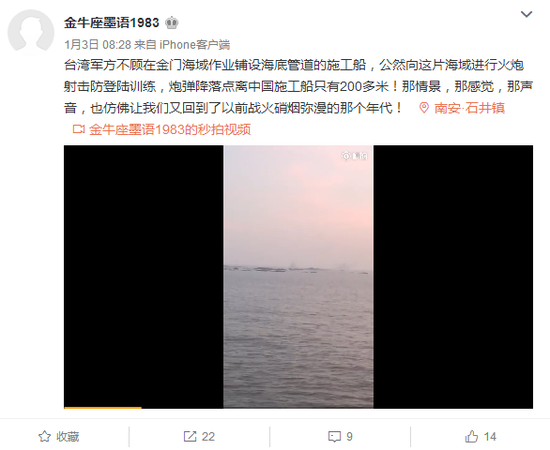 [环球时报-环球网报道 记者 范凌志]3日,大陆网络流传一则消息称“台湾军方不顾在金门海域作业铺设海底管道的大陆施工船,公然向这片海域进行火炮射击防登陆训练,炮弹降落点距离大陆施工船只有200多米”。该微博还称“那情景,那感觉,那声音,也仿佛让我们又回到了以前战火硝烟弥漫的那个年代”。《环球时报》记者4日就此消息向福建省晋金供水有限公司求证,工作人员杨先生告诉记者,自己并不清楚网上所传的消息,但这几天并没有船只在海上施工。