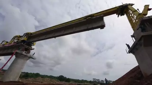 曹方文,架设现场总指挥,这是蒙内铁路上的第一座桥梁。此刻正在进行最后两片钢梁的架设。