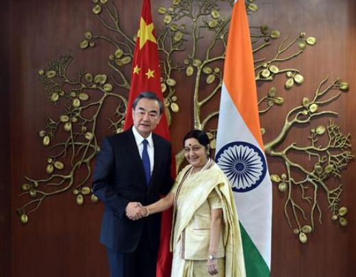 2017年12月,外交部长王毅在新德里出席中俄印外长第十五次会晤期间会见印度外长斯瓦拉吉。(中国外交部)