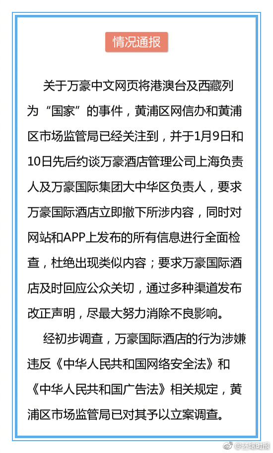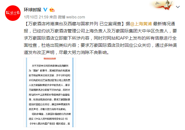 原标题:万豪酒店将港澳台及西藏与国家并列 已立案调查