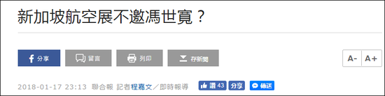 联合新闻网报道称,有消息人士透露,新加坡并未按照以往惯例,邀请台湾“国防部长”冯世宽前往参观。分析声称,这是在大陆方面不断施压新加坡,使其减少与台湾的军事合作。