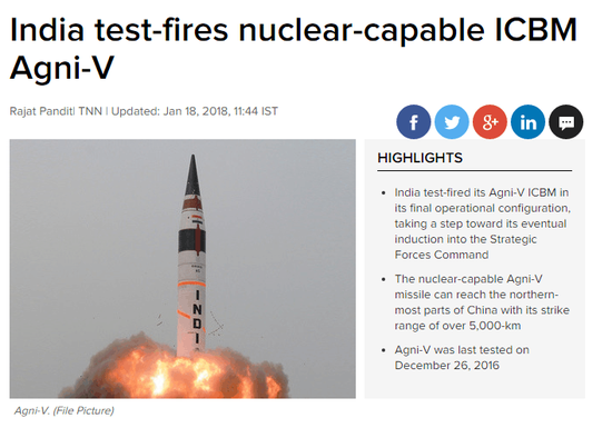 “我们今天已成功发射具备核能力的弹道导弹烈火-5。”印度国防部长宣布了该消息。《印度时报》称,之前的烈火1-3系列主要针对巴基斯坦,而烈火-4和烈火-5明确意在威慑中国。