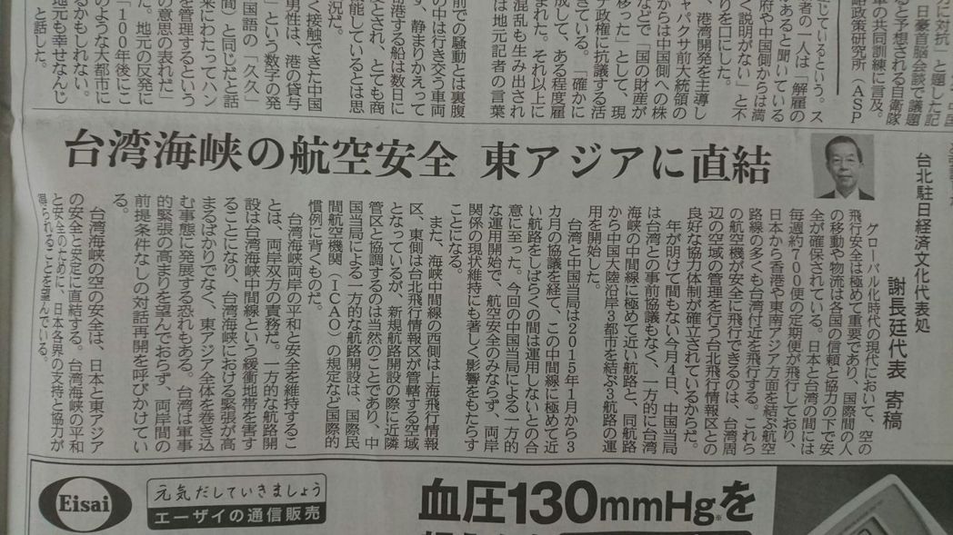 台湾“联合新闻网”18日报道称,谢长廷18日以“台湾海峡之飞航安全,与东亚息息相关”为题,在日本右翼媒体《产经新闻》上撰文称,今年1月4日,大陆“未经事前协商,片面启用接近台湾海峡中线之航线,并与该航线至大陆沿岸三都市之航线。台湾与大陆自2015年1月起,历经3个月协商,达成该极为接近海峡中间航线暂缓启用的共识,这次大陆片面启用,不仅影响航空安全,更对两岸关系维持现状带来明显影响”。