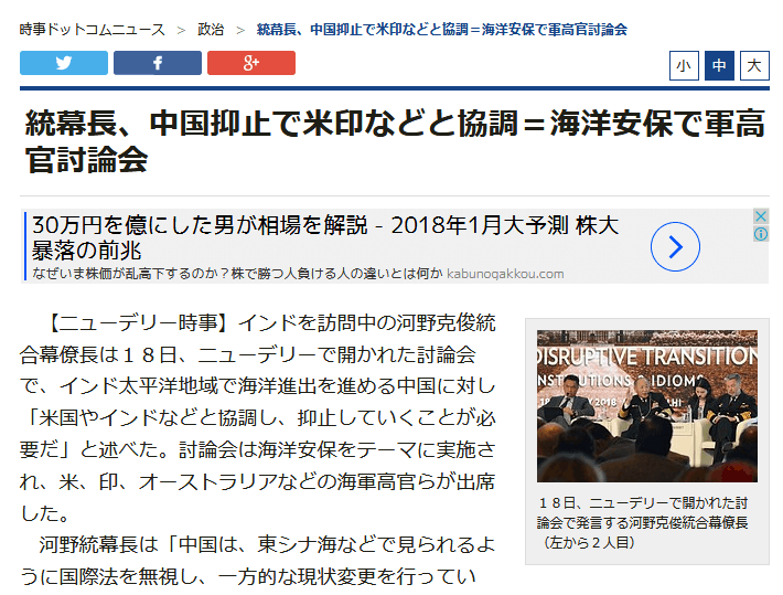 据日本时事通信社报道,河野克俊当日出席一个旨在讨论海洋安保的会议。一同出席的还有美国、印度、澳大利亚等国的海军高官等。河野在会上批评中国在东海等海域“无视国际法”,“正单方面改变现状”。他还放出狠话——“虽然难以通过武力促使中国改变行动。(但如果中国持续动作),可以通过营造孤立中国的环境,迫使其改变行动”。时事通信社认为,该发言显示出日本要与美印澳及东盟国家强化合作的方针。