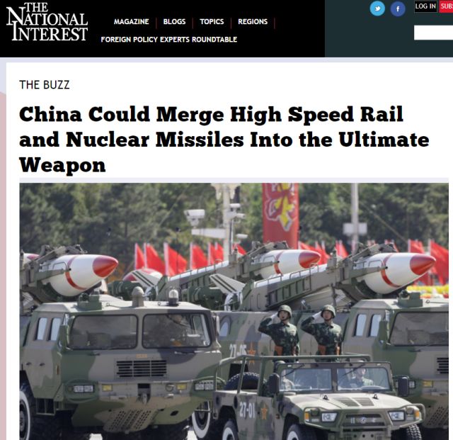 中国不断延伸的高铁线路让美国媒体产生了奇怪的猜想。美国《国家利益》杂志网站18日称,解放军很可能将装备核弹头的洲际弹道导弹伪装成普通高铁,借助漫长的高铁网躲避美国侦察卫星的监视。