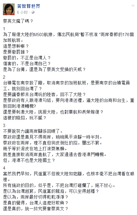 黄智贤在文中还痛批台当局“不要说努力让两岸关系回暖了。蔡政府还是真见不得两岸,稍稍风平浪静一时半刻。蔡政府在两岸,理不直但狗皮倒灶的招,层出不穷。几乎等于泼皮在地上打滚耍无赖。就差直接取消两岸直航了,大家通通去香港澳门转机。但港澳不也是大陆国土?”