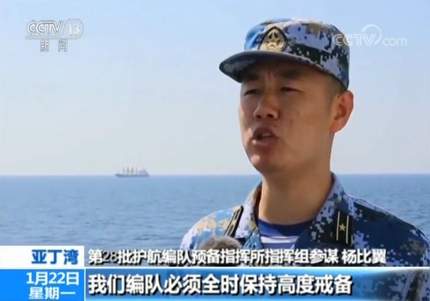 第二十八批护航编队预备指挥所指挥组参谋杨比翼:当前亚丁湾海域气象较好,可疑小艇比较活跃,反海盗形势比较严峻,我们护航编队必须时刻保持高度戒备,一有情况能够及时、果断、稳妥处置,确保被护船舶和编队自身两个百分之百安全。