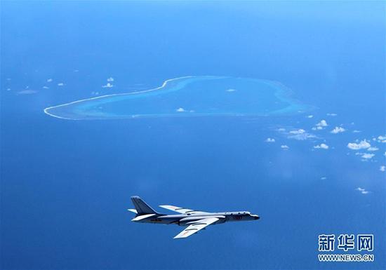 资料图:中国空军轰-6K飞机在黄岩岛等岛礁附近空域巡航。(图源:新华网)