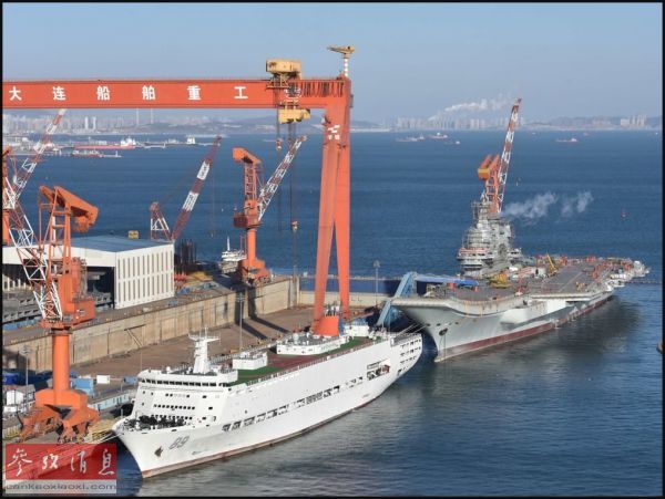 日前,一艘舷号为89的中国航母保障船抵达了大连,并停靠在中国第2艘航母(俗称001A型航母)前。这引发外界猜测中国人民解放军海军和船厂正为该航母在近期进行首次海试做准备。