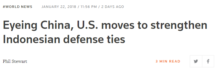 另据路透社1月22日报道,美国国防部长马蒂斯当天说,在访问印尼期间他会探讨加深两国的防务关系。印尼似乎越来越愿意争夺南海的主权。
