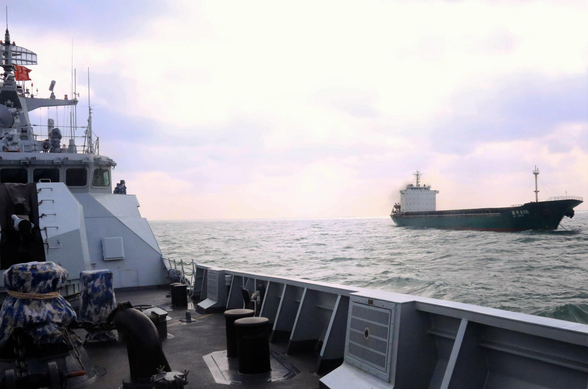 军事:货船在黄海失火 我军056舰成功营救全部16名船员