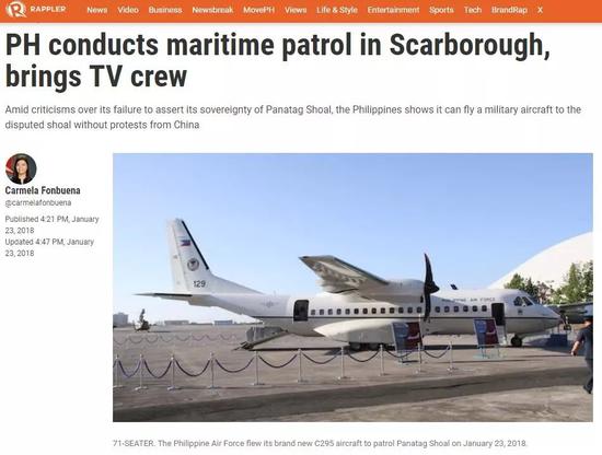 据香港《东方日报》网站1月25日援引菲律宾媒体报道,菲律宾空军C295型飞机于23日上午在黄岩岛约1500米上空盘旋近30分钟,当地一名电视台记者亦有随行。菲律宾北吕宋司令部发言人说,菲空军当天在黄岩岛上空盘旋了两次,范围约103平方公里。