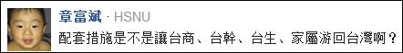而台湾陆委会负责人张小月29日竟放话称,“没有妥协、让步空间”,但是会有所谓配套措施,不会让台商无法回家。但是这也引来讽刺:“配套措施是要游回台湾吗?”