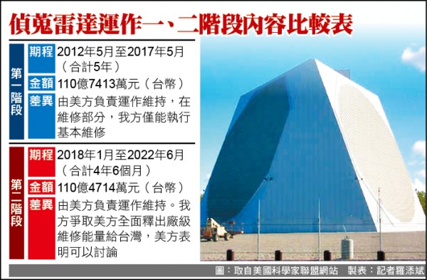这套雷达系统採购金额达四百亿元新台币,后续由美方执行运作的维持费用同样吓人,仅仅在第一阶段(2012年到2017年)的五年,费用达到110亿7413万元新台币。