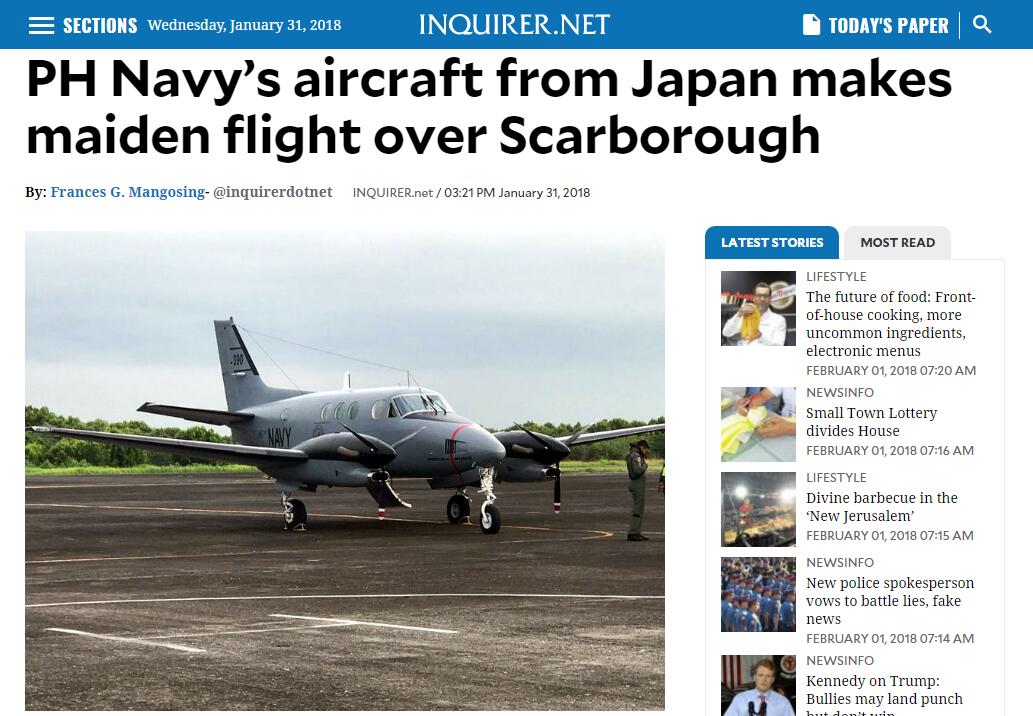 【环球网报道记者张骜】日本去年捐赠给菲律宾5架双涡轮螺旋桨的比奇空中国王飞机TC-90。据菲律宾《每日问讯者报》报道,菲律宾海军1月31日驾驶了其中一架进行了首航,第一次飞行就去了黄岩岛。