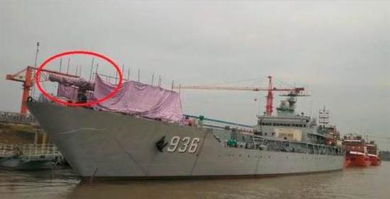 照片显示,一艘22年前服役的072型坦克登陆舰海洋山舰(936)经过重大改装后下水,舰艏出现一门体积庞大,造型怪异的舰炮。有军事专家认为,这门舰炮是中国自制新型155毫米舰炮。不过,也有专家表示,这是中国海军的电磁轨道炮。
