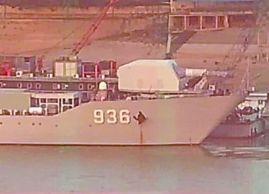 中时电子报称,从1月31日开始流传的一组照片显示,解放军“海洋山”号大型坦克登陆舰(舷号936)近日在武汉完成改装。它拆除了舰艏的双37毫米舰炮,取而代之的是一座体积惊人的全封闭炮塔。在这座炮塔后方的甲板上,还固定着几个装满设备的集装箱。报道认为,这门火炮比解放军海军口径最大的130毫米舰炮还粗了不少,综合各方面特征,尤其是该炮后方的配套设备方舱,这显然是一门电磁轨道炮。