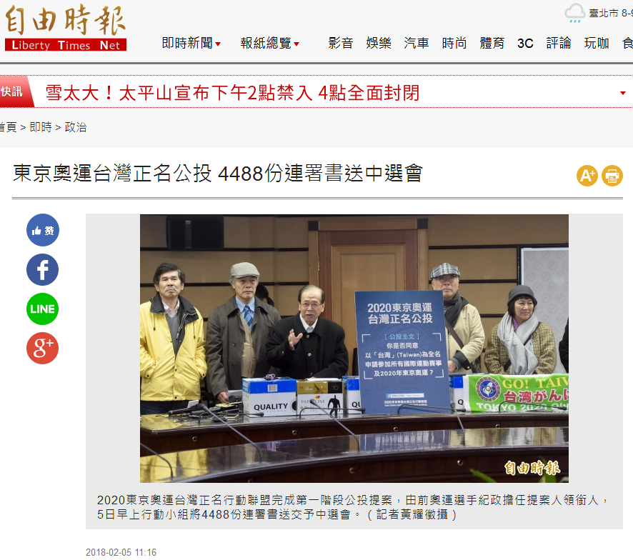 报道中写道,该“正名公投”一月内的联署人数“踊跃”“正名行动小组今日(5日)正式将4488份连署书送交中选会”。