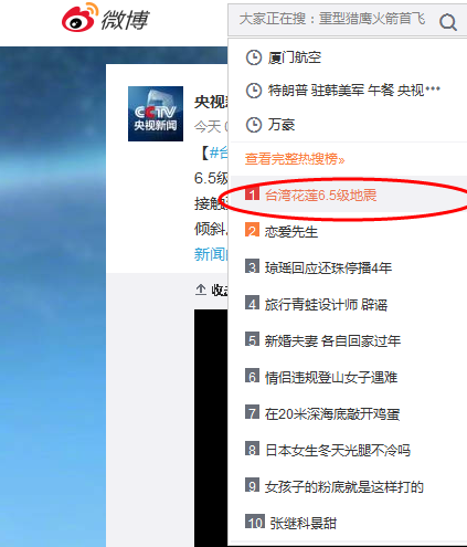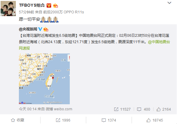 [环球网报道]台湾花莲附近海域6日午夜地生6.5级地震,并出现人员伤亡。今天一早,不仅花莲地震登上微博热搜第一,“为花莲祈福”更成为大陆互联网的主情绪。在海峡对岸,大陆网友的暖心信号连岛内绿媒都接受到了。台湾“东森新闻云”说,大陆网友这是在“跨海送暖”。