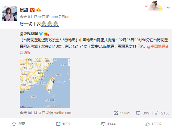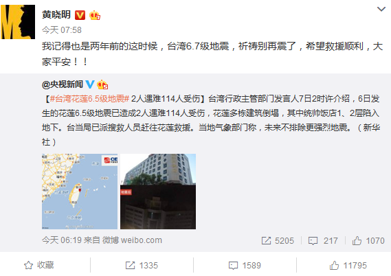 这其中也包括了大陆的一众明星们,地震发生后,黄晓明、杨颖、景甜和TFboys均在微博中为花莲灾区民众祈福,表示“愿大家平安”。