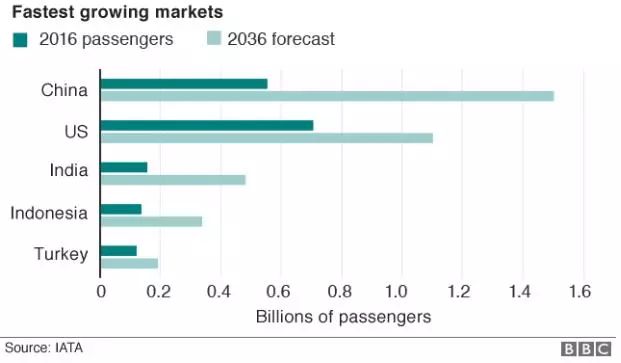 国际航空运输协会预计,中国将在未来20年轻松超越美国,成为全球最大的航空市场。2016年,航空乘客人数约为5.37亿人次,而到2036年,这一数字预计将达到14.6亿人次。