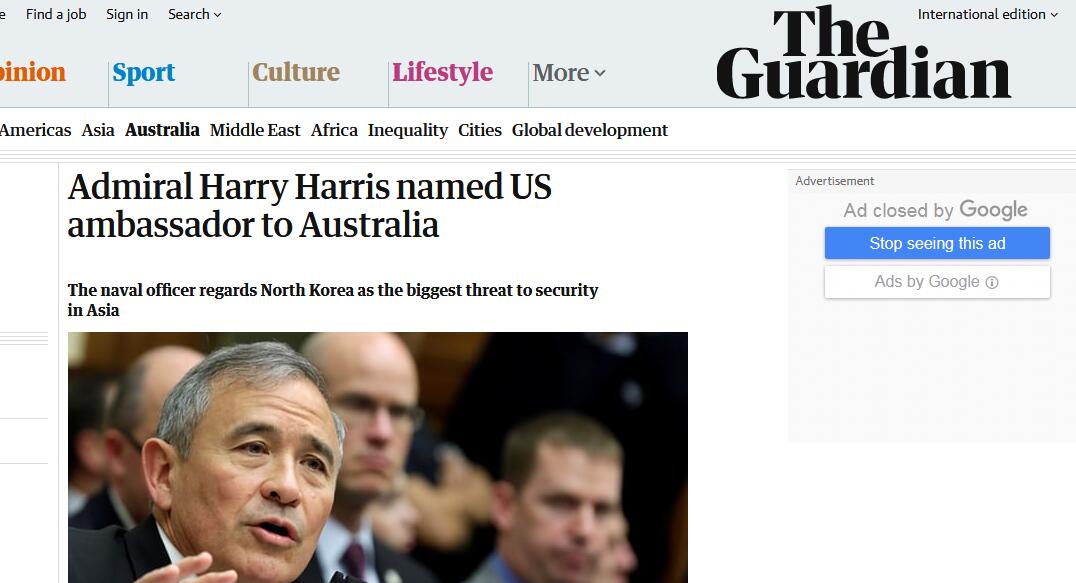 [环球网报道记者查希]英国《卫报》2月9日报道,美国白宫周五(9日)宣布,总统特朗普提名美军太平洋司令部司令哈里斯(HarryHarris)为驻澳大利亚大使。