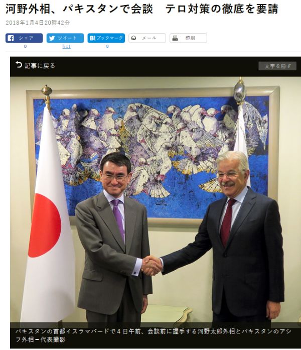 ▲1月4日,日本外相河野太郎与巴基斯坦外长阿西夫举行会谈。(《朝日新闻》)