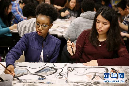 2017年3月9日,在芝加哥佩顿中学,学生在校内的孔子学院教室学习画中国水墨画 图片来源:新华网