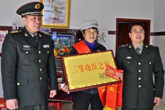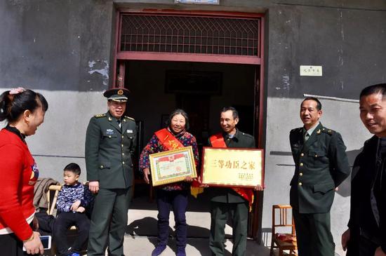 ▲金溪籍军官夏伟的父母在外地,县人武部把立功喜报和“三等功臣之家”牌匾送到他的岳父岳母家,两位老人对女婿立功很是骄傲和欣慰。