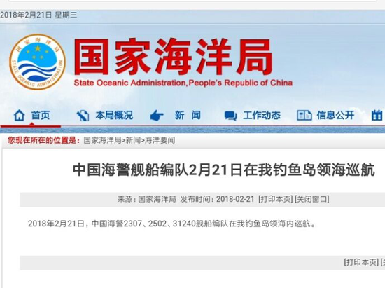 据国家海洋局网站发布消息,2018年2月21日,中国海警2307、2502、31240舰船编队在中国钓鱼岛领海内巡航。这是继本月13日后中国海警舰船编队第二次常态化巡航我国钓鱼岛!