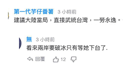 有台湾网民直呼,“看来两岸要破冰只有等她(蔡英文)下台了”,“建议大陆直接‘武统’,一劳永逸”。