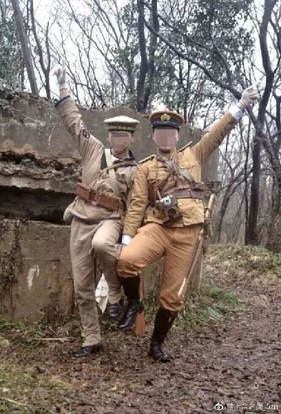 在一组被曝光的照片中,他们身穿二战日本军服,手持军刀,站在南京紫金山上各种摆拍。