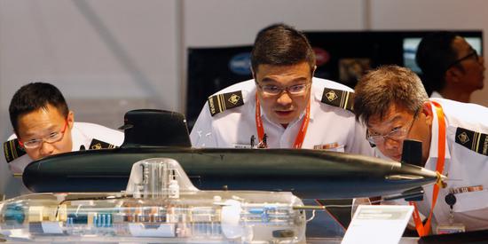 在2015年新加坡海事防务展上观看法国潜艇的新加坡海军军官,由于美国不制造常规潜艇,自诩为西方阵营的一些国家就不得不转向欧洲购买潜艇 图源:新加坡海事防务展官网
