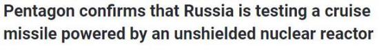 美国Next Big future网站报道标题称:“五角大楼确认,俄罗斯进行了无屏蔽的核反应堆驱动的巡航导弹试验”。