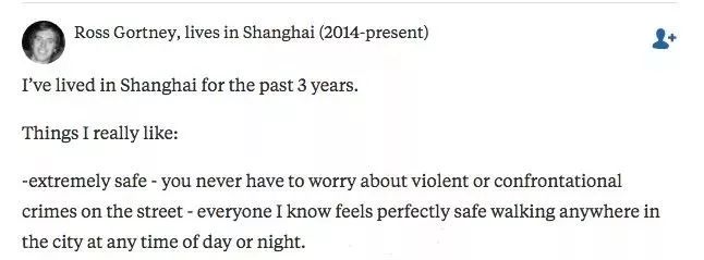 被提及次数第二多的,是赞扬中国的安全程度。现居中国上海的Ross Gortney直言从来都不担心安全问题,走哪里都不怕,安全感十足!
