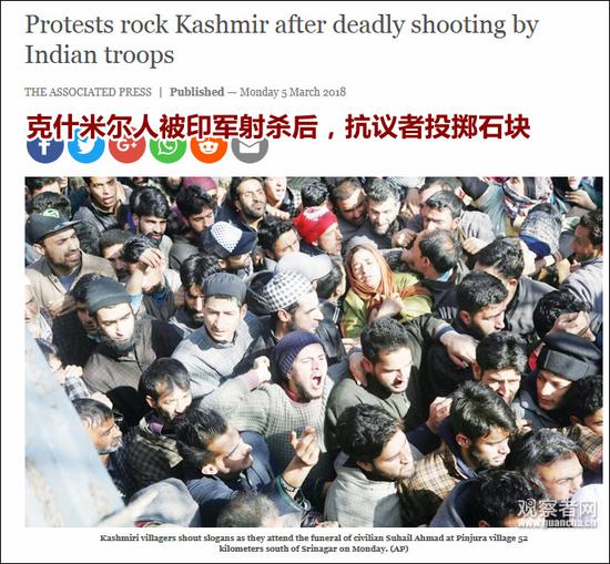 近日,克什米尔地区局势仍然紧张,时有激烈冲突。3月4日,印度军队在印控区域开枪打死4名平民和2名疑似激进分子,造成上万愤怒平民抗议,他们向印度军方投掷石块,场面非常激烈。
