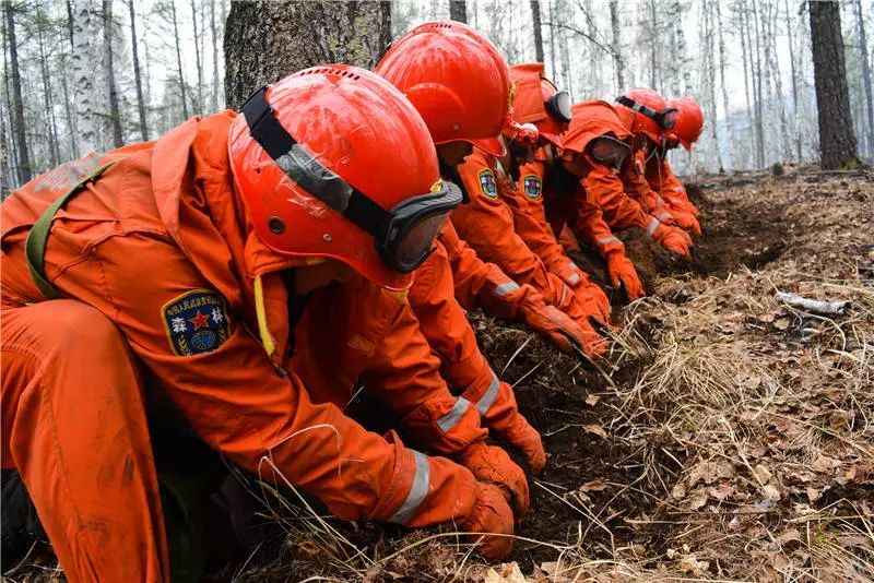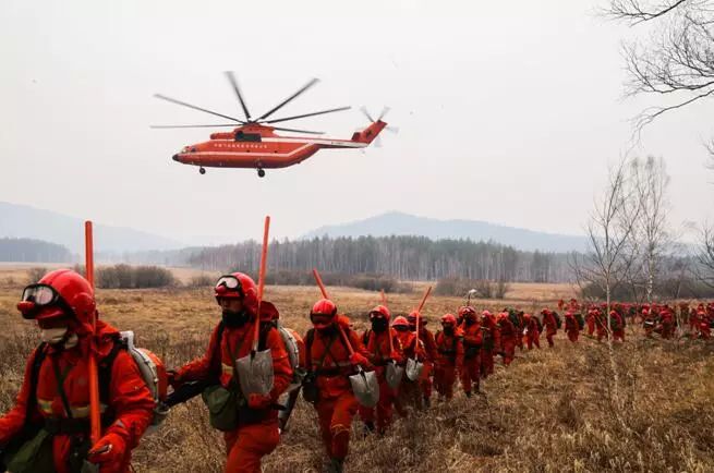 图为2017年5月3日,武警呼伦贝尔森林支队将兵力空投至火场山下,官兵们徒步向火场开进。