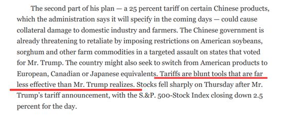《纽约时报》也在该报的社论中指出,一旦中国对美国的制裁进行反击,那么特朗普发起的这轮贸易战就将给美国国内的工业和农业造成误伤。