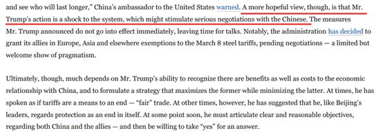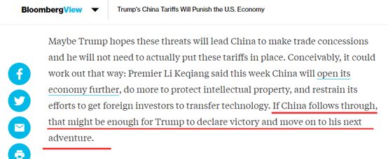 另外,《彭博社》也在其社论中希望特朗普只是在用这种方式逼中国在谈判中让步,而不会真的要和中国打贸易战。
