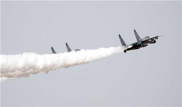 3月28日,空军两架战斗机低空通场,向烈士致敬。新华社记者李刚 摄