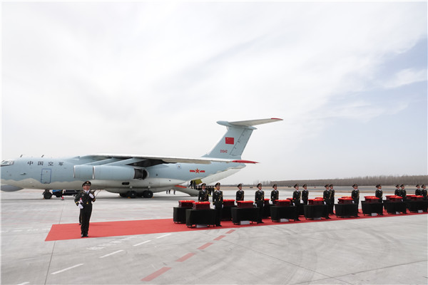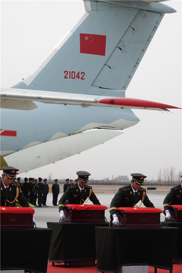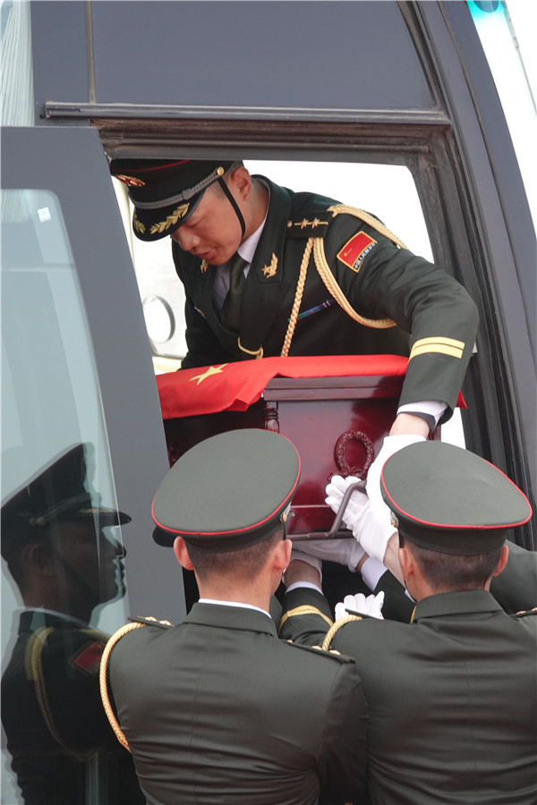 当天上午11时20分许,解放军空军一架专机平稳降落在辽宁沈阳桃仙国际机场,这架飞机当天从韩国仁川国际机场起飞回国,机上载有20位志愿军烈士的遗骸及相关遗物。专机进入中国领空后,两架战斗机全程护航,用空军特有的方式向志愿军烈士致敬。