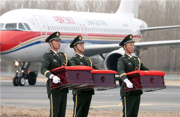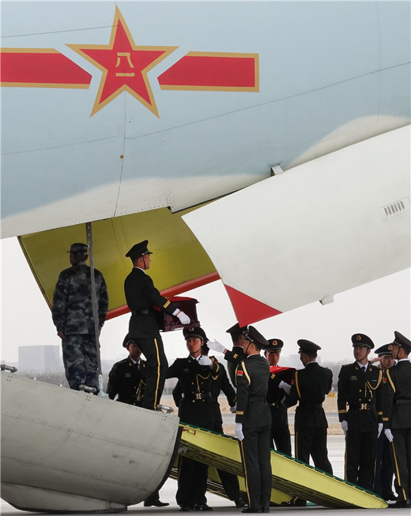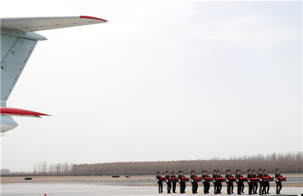 3月28日,在沈阳桃仙机场,礼兵将志愿军烈士遗骸棺椁从专机上护送至棺椁摆放区。新华社记者李刚 摄